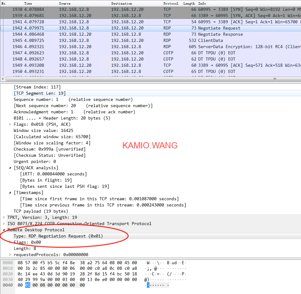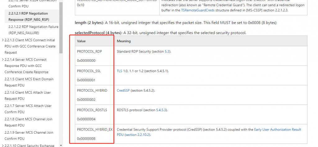 到了第二天我决定抓包来分析整个握手过程,SYN三次握手手,抛的第一条数据是协商数据,协商类型为RDP,接下来我们就可以有的放矢了,搜索所有关于能修改RDP协商的文档