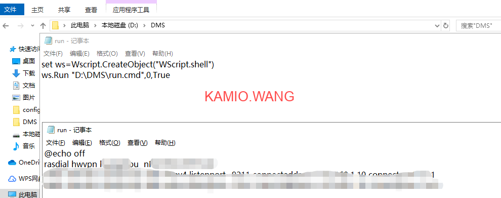 step1、写了个cmd文件,然后,让其通过命令来连VPN,再写一个VBS,无窗口模式来调用这个cmd文件。如下图,上面的是vbs无窗运行,下面是cmd连VPN的指令,后面还有相关的路由,这个我做了模糊处理。